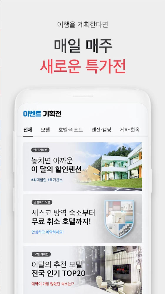 내주변 추천 숙소 할인 혜택, 매일 매주 새로운 특가전.