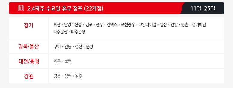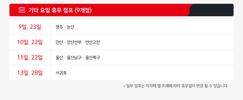 * 일부 점포는 지자체 별 조례에 따라 휴무일이 변경 될 수 있습니다.