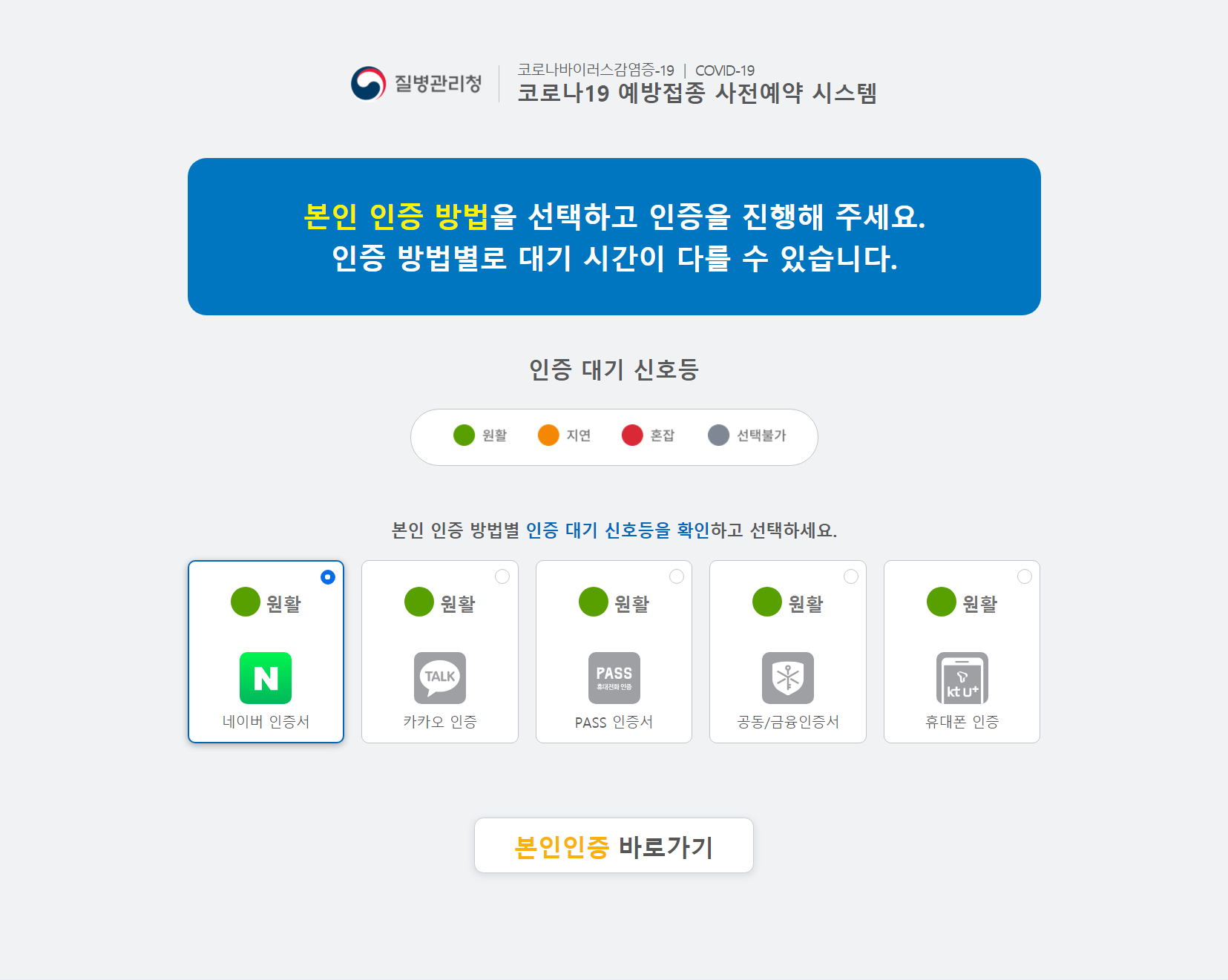 본인 인증 방법별 인증 대기 신호등을 확인하고 선택하세요.