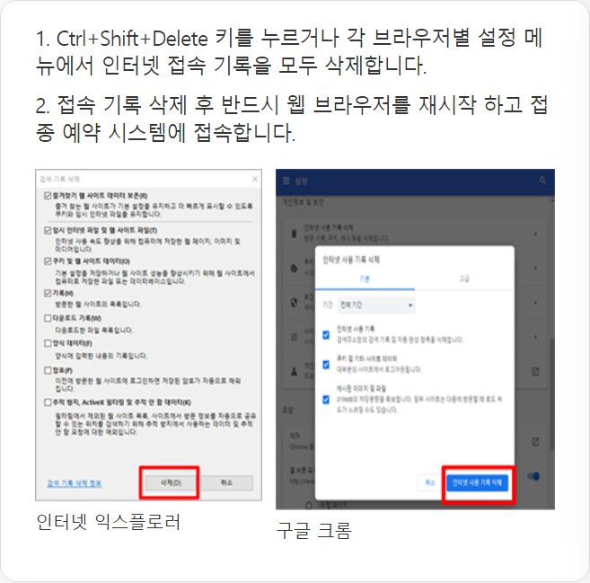 2) 접속 기록 삭제 후 반드시 웹 브라우저를 재시작 하고 접종 예약 시스템에 접속합니다.
