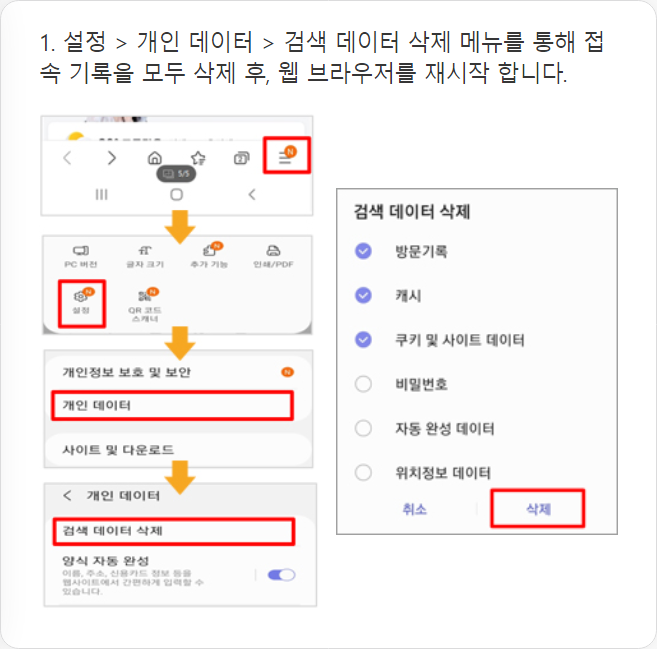 1) 설정 > 개인 데이터 > 검색 데이터 삭제 메뉴를 통해 접속 기록을 모두 삭제 후, 웹 브라우저를 재시작 합니다.