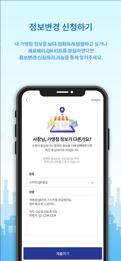 정보변경 신청하기에는 내 가맹점 정보를 보다 정확하게 반영하고 싶거나제로페이 QR 키트를 분실하였다면정보변경 신청하기 기능을 통해 알려주세요. 최적경로 찾기는 방문하고 싶은 가맹점의 거리부터경로까지 제공합니다.
