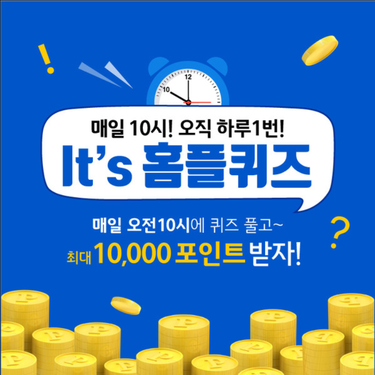 홈플퀴즈는 매일 진행되며 오전 10시부터 12시까지 1차 진행됩니다. 정답자들은 10포인트에서 최대 1만 포인트까지 랜덤으로 적립할 수 있습니다.
