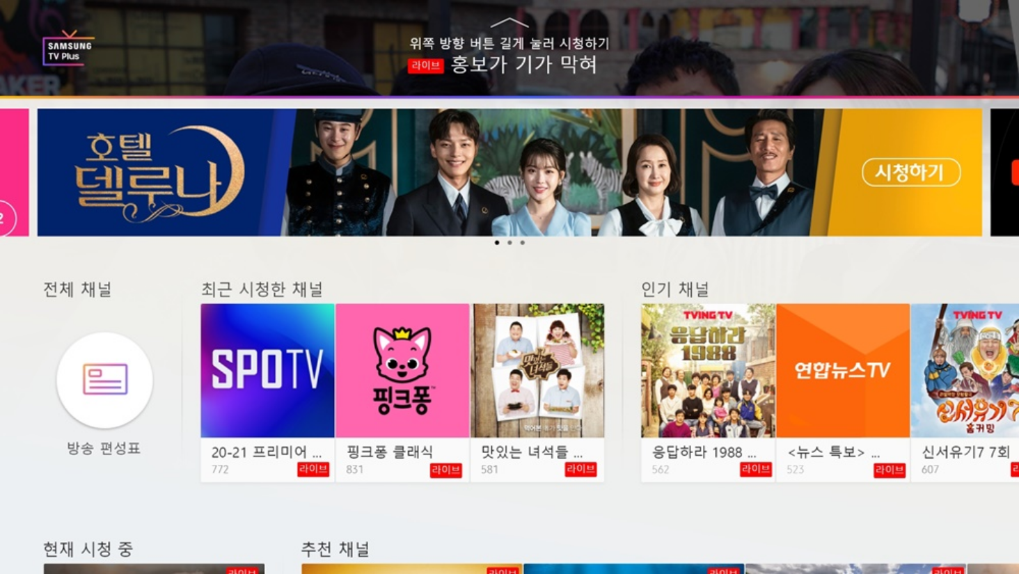 전체 채널, 최근 시청한 채널, 인기 채널, 현재 시청 중, 추천 채널