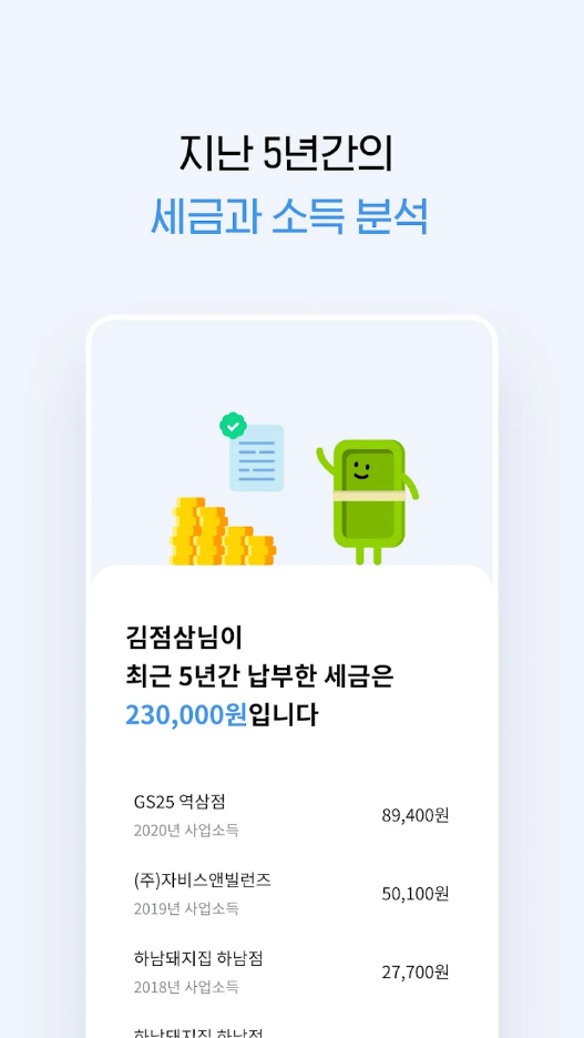 절세의 측면에서 지속적인 가치를 만드는 데 집중하고 있어, 모든 소득과 추가 공제 항목을 합산해 최대 5개년도까지 한번에 신고하고 있으며, 어렵고 복잡한 세금 신고를 누구나 쉽고 빠르고 간편하게 이용할 수 있는 서비스라고 합니다.