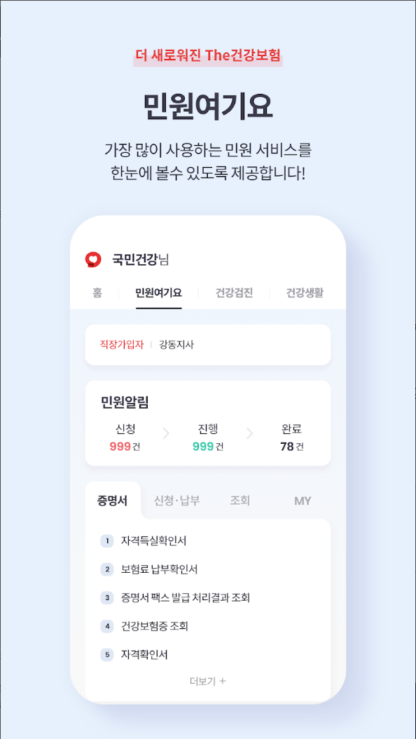 주요 기능은 민원여기요, 건강iN, 장기요양보험, 고객센터 등의 메뉴를 갖추고 있으므로 공동, 금융, 민간, 건강보험 인증서 등 8종의 다양한 인증 방식으로 로그인하여 이용할 수 있고, 주요 질환별 지역별 위험도를 알려주는 건강알람정보를 위젯으로 설정할 수 있습니다.
