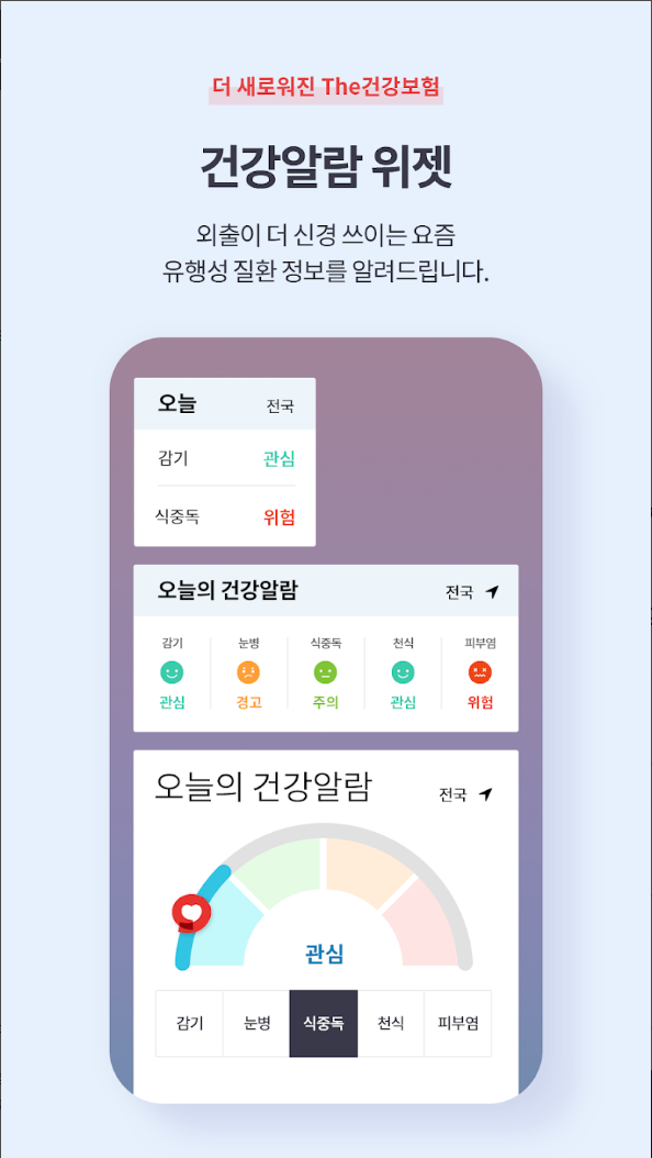 - 주요 질환별 지역별 위험도를 알려주는 건강알람정보를 위젯으로 설정할 수 있습니다.