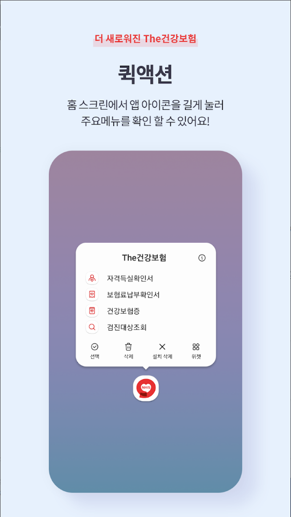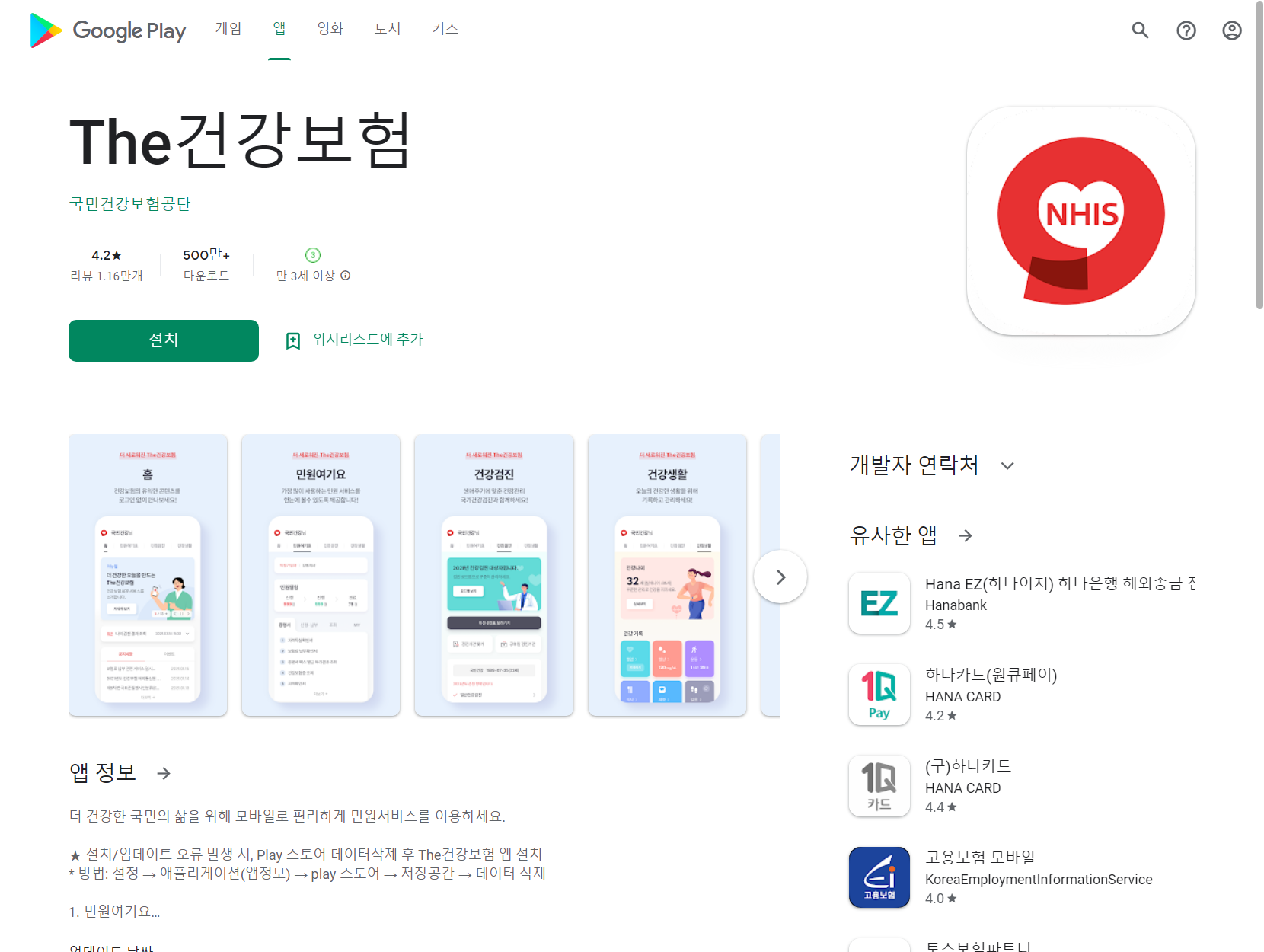 주요 기능은 민원여기요, 건강iN, 장기요양보험, 고객센터 등의 메뉴를 갖추고 있으므로 공동, 금융, 민간, 건강보험 인증서 등 8종의 다양한 인증 방식으로 로그인하여 이용할 수 있고, 주요 질환별 지역별 위험도를 알려주는 건강알람정보를 위젯으로 설정할 수 있습니다.