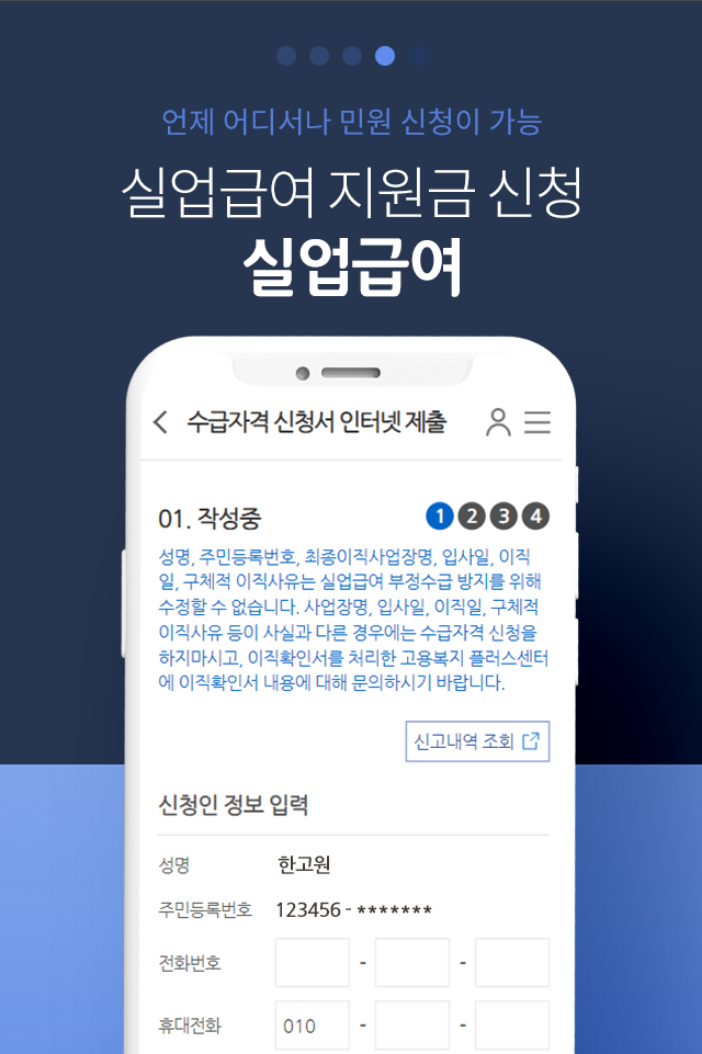 또, 언제 어디서나 민원 신청이 가능하여실업급여 지원금 신청이나 실업급여 수급자격 신청서 인터넷 제출, 신고내역 조회 및 모성보호 지원금 신청을 위한 모성보호 메뉴에서 육아휴직 급여신청 작성 및 신청 정보 조회, 접수번호, 접수일자, 처리기간까지 상세하게 확인하여 이용할 수 있습니다.