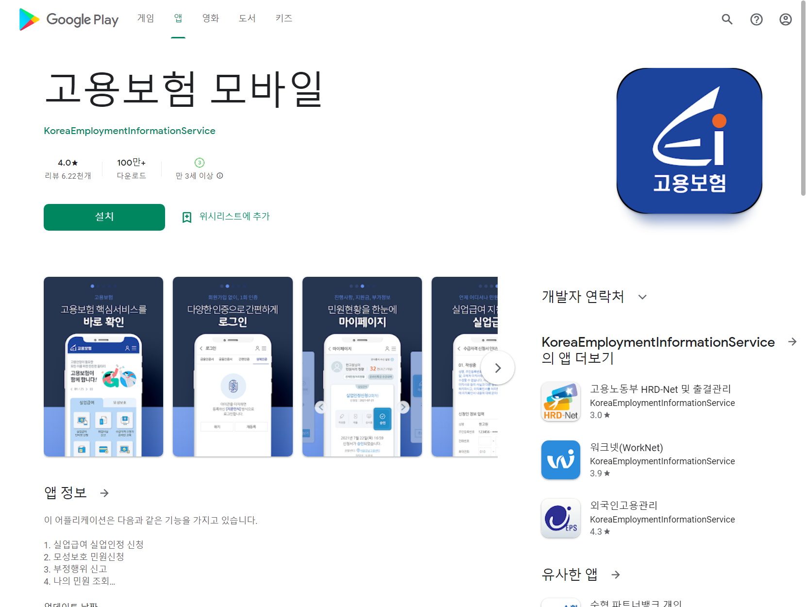 고용보험 모바일을 위한 어플리케이션입니다. (Android : 5.0 이상)