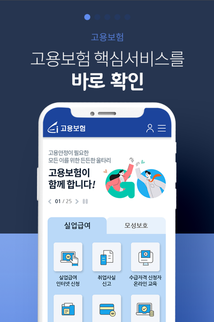 고용보험센터의 고용보험 홈페이지 실업급여 신청 및 육아휴직 신청 등을 간편하게 진행할 수 있는 고용보험 모바일 앱은 고용보험 핵심서비스를 바로 확인 할 수 있으며, 실업급여 인터넷 신청, 취업사실 신고, 수급자격 신청자 온라인 교육 등의 서비스를 지원하고 있습니다.