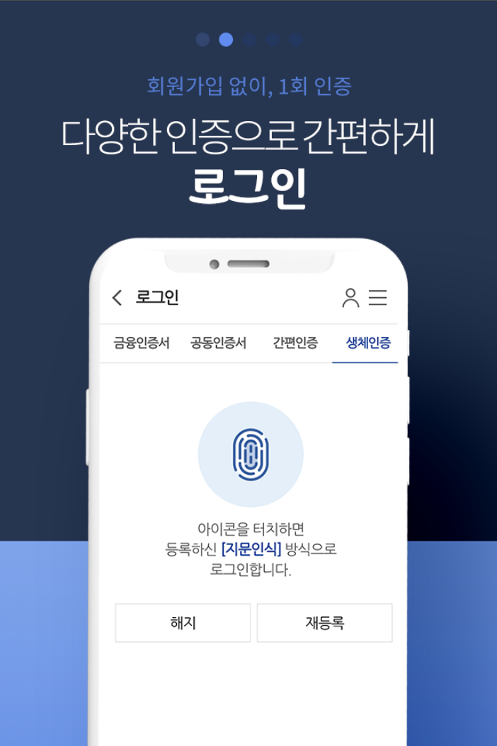 회원가입 없이, 1회 인증으로 금융인증서, 공동인증서, 간편인증, 생체인증 로그인과 해지 및 재등록 등의 다양한 인증으로 간편하게 로그인이 가능합니다.