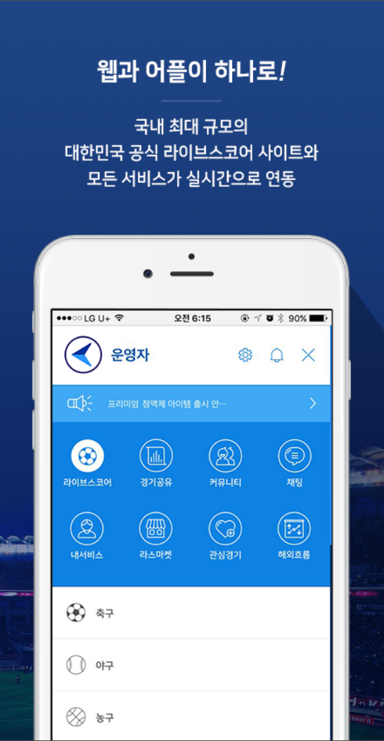 대한민국 최대 규모의 라이브스코어의 공식 어플을 지금 바로 만나보세요!