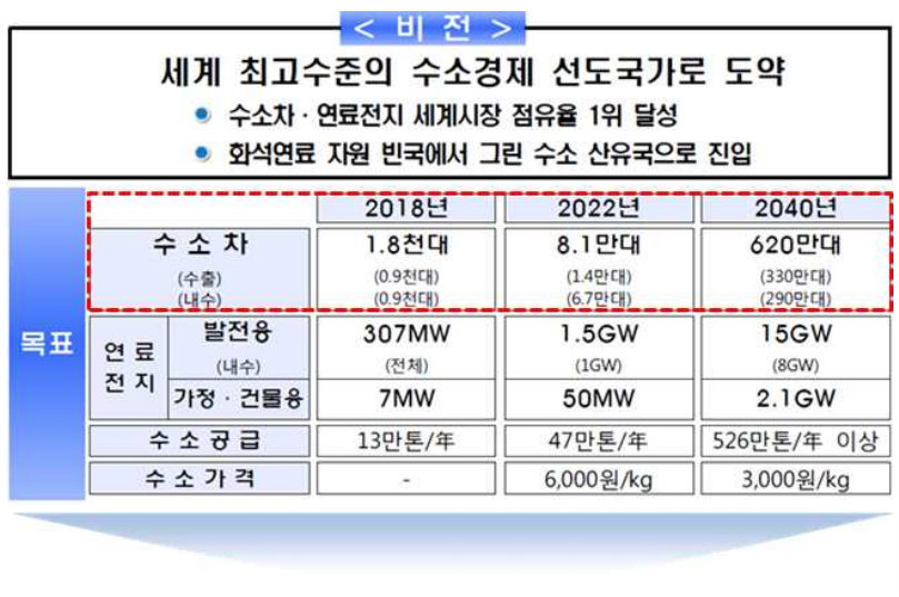 o 수소차 누적 생산량을 2018년 2천 대에서 2040년 620만 대(내수 290만 대, 수출 330만 대)로 확대하고, 세계시장 점유율 1위를 달성하는 것을 목표로 수립하였다.